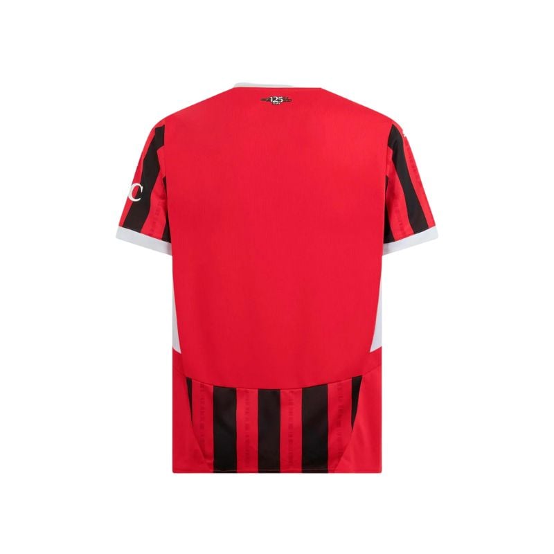 The AC Milan Home Kit for Kids 2024-2025 celebrates the club’s 125th anniversary with a traditional yet fresh design. This kit features the classic red and black stripes synonymous with AC Milan, with a special touch of white detailing that adds to its elegance. The jersey incorporates a unique design element within the stripes that visually represents the human genome, symbolizing the passion that has been passed down through generations of Milan fans, or as it’s known, ‘Milanismo’.