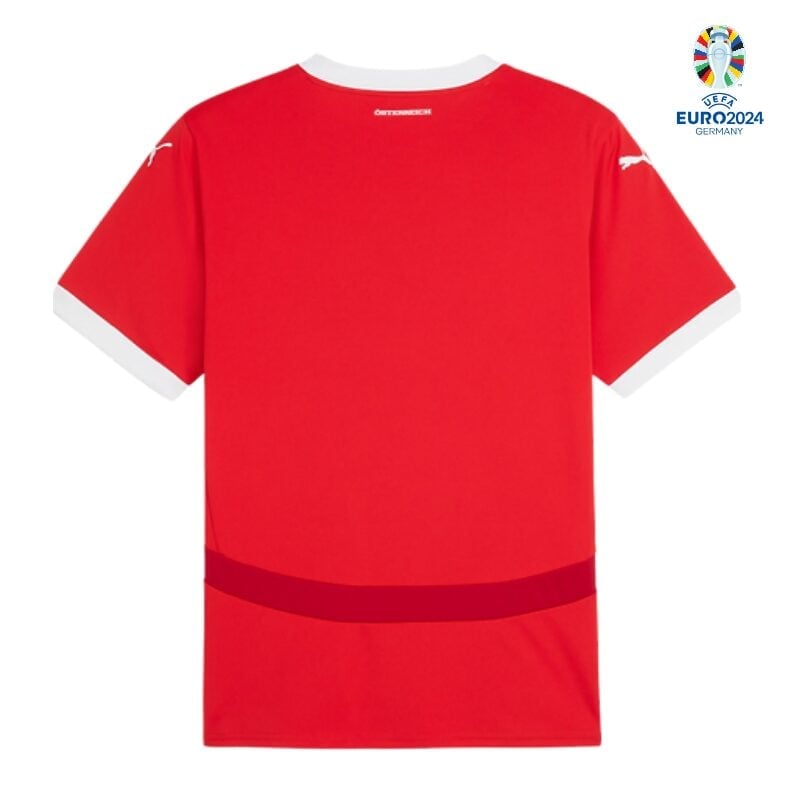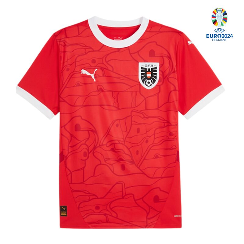 Wear the pride of Austria with the 2024 home kit, crafted by Puma. This bold red design, inspired by the Austrian flag and flowing water motifs, features subtle white accents on the sleeves. With breathable, 100% recycled fabric, it’s ideal for fans of Die Mannschaft.