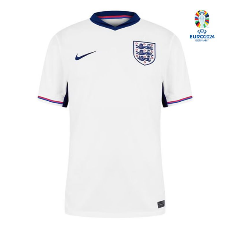 The England Home Shirt for Euro 2024 is a modern take on the classic white strip, reflecting both tradition and contemporary design elements. The shirt features the iconic white color synonymous with England’s football heritage, accented by a bold purple trim on the cuffs, which pays homage to the training gear of England’s 1966 World Cup-winning team. This design choice has sparked some controversy due to the inclusion of a multicolor St. George’s Cross on the back of the collar, replacing the traditional red-and-white with pink, purple, red, and blue.