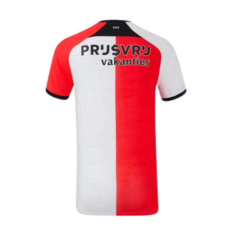 The Feyenoord Home Shirt for the 2024-2025 season is a tribute to both the club’s heritage and the city of Rotterdam. Designed by Castore, this shirt features a classic half-and-half design with red on the right and white on the left, emblematic of Feyenoord’s traditional colors. The sleeves contrast this with white on the right and red on the left. A notable design element includes flowing lines on the shirt’s body, inspired by the waters that are deeply connected to Rotterdam, such as the Nieuwe Maas and the Rotte, symbolizing the city’s maritime identity.