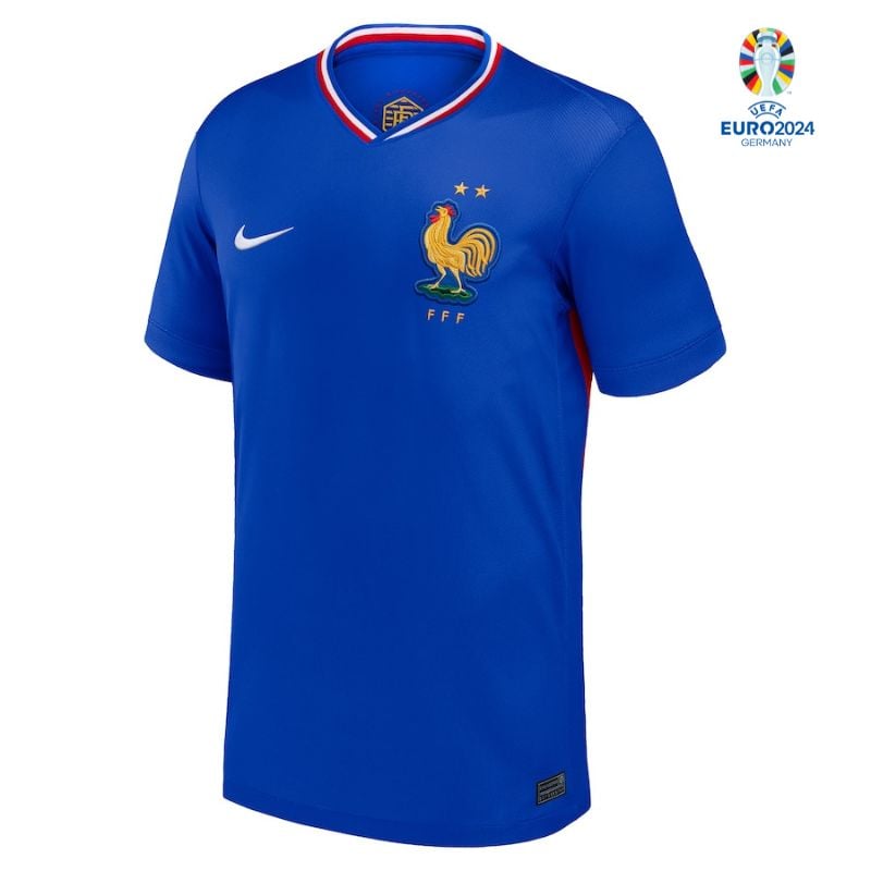 The France Home Shirt for Euro 2024 by Nike introduces a design that pays homage to the storied past of the French national team. This shirt features a striking “Bright Blue” hue, moving away from the navy colors used recently, and introduces “University Red” and white accents for a classic yet modern look. The most notable feature of this kit is its crest, which adopts a vibrant, full-color approach, breaking from the monochrome trend of previous Nike kits for France. This oversized crest echoes the designs from the 1980s, celebrating the era when France won the European Championship and reached World Cup semi-finals.