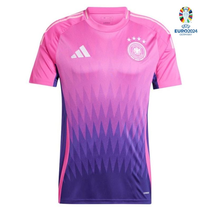 The Germany Away Shirt for 2024, designed by Adidas for the Euro 2024 tournament, is a bold departure from traditional football kits, embracing a vibrant color scheme that reflects a modern aesthetic. This kit features a unique combination of pink and purple, officially described as Semi Lucid Fuchsia and Team College Purple, with a gradient that transitions from a brighter pink at the top to a darker purple towards the bottom. This design choice not only evokes memories of Germany’s historical kits, like the 1990 World Cup goalkeeper shirt, but also aims to appeal to a new generation of fans by incorporating elements inspired by the digital world of the metaverse.