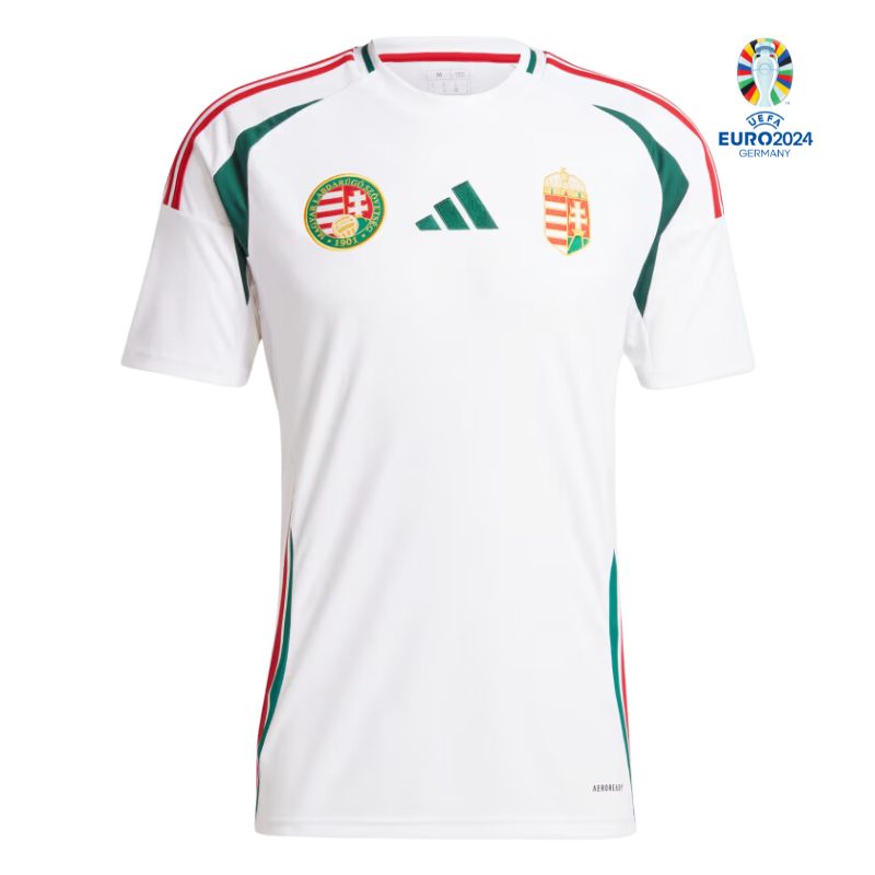 The Hungary Away Shirt for 2024, crafted by Adidas, showcases a clean white design that pays homage to Hungary’s national flag through its color accents. This away kit is characterized by its slim fit silhouette and is made from 100% recycled polyester, incorporating AEROREADY technology to manage moisture effectively, ensuring fans and players remain comfortable during the game. The shirt features a ribbed crewneck for a classic look, with the iconic Hungarian national team crest prominently displayed on the chest. The colorway includes the national flag’s red and green, with wavy designs symbolizing the patriotic flag waving by supporters. “Magyarország,” the Hungarian word for Hungary, is printed on the back neck, adding a personal touch of national pride. This design not only reflects the team’s unity and heritage but also emphasizes sustainability, making it a choice for environmentally conscious fans.