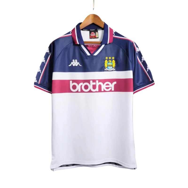 Dive into history with the Manchester City 1997-1998 away vintage jersey by Kappa, sponsored by Brother. In elegant white with bordeaux and blue accents, this retro design from the Division 2 era is a collector’s gem. Comfortable and iconic, available on elitesoccer.store